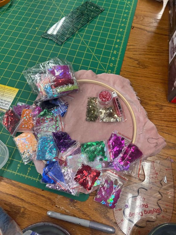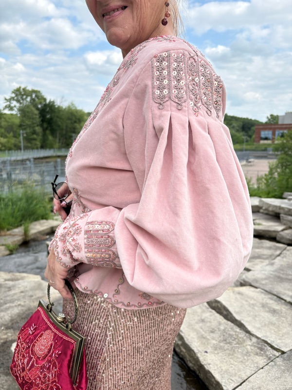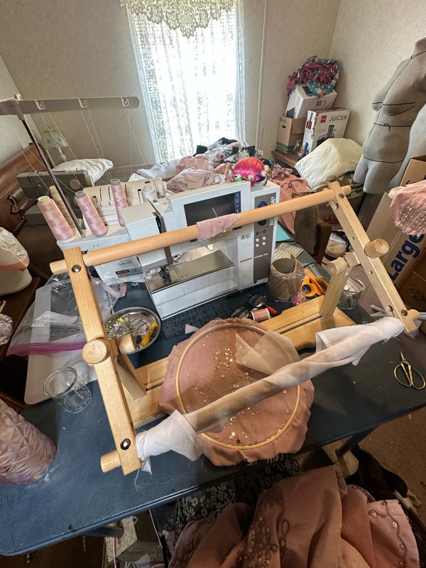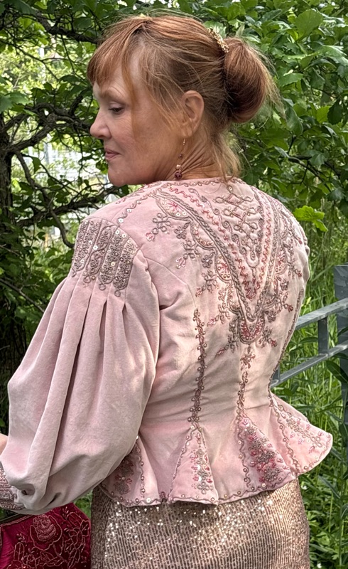 Seriously though, much of my time with this jacket was spent tucked up in the corner with my embroidery frame and craft light while my mom and my husband watched the Cardinals and the Chiefs. My first picture is time stamped July 9, 2024 and the video of my last stitch was recorded on June 7, 2025. I worked steadily over 47 weeks, with a three week break to make an unrelated costume for a sci-fi and fantasy convention Masquerade. I worked two or three hours per night most of the time. I did take some nights off, but if I averaged five nights a week, it comes out to about 440 hours total, from developing and practicing designs with the chain and sequins through to the final stitch on the last hook and eye. I never rushed anything, I just relaxed and enjoyed every single minute I worked on it.