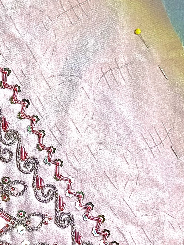 Since I had beads and sequins clear up to the edge I pressed only very lightly and used sort of a pick stitch to flatten the edges. Very small stitches on the facing side, going up through beads or chain braid on the outside to hide the stitches.