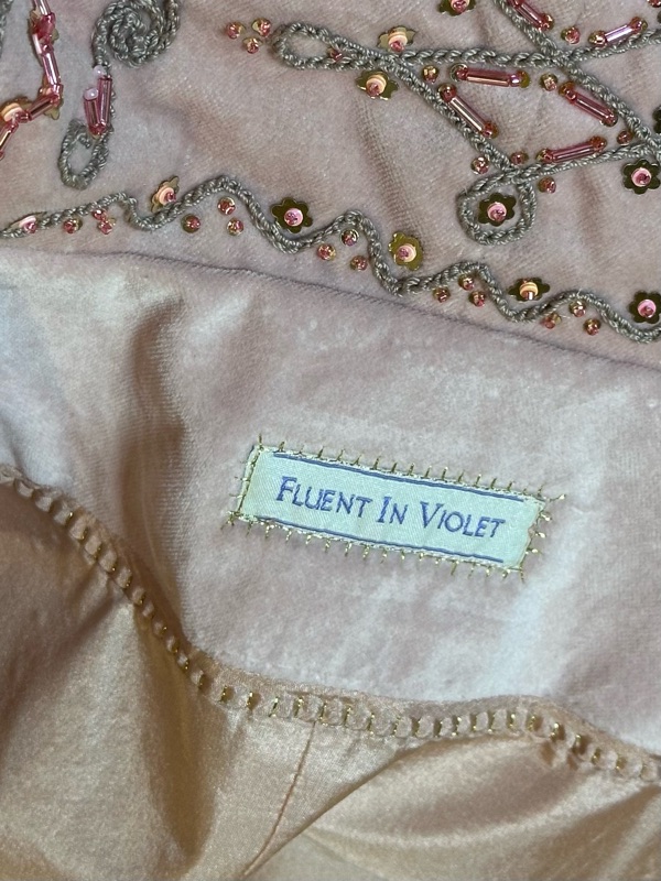 The fabric is a cotton velveteen IKEA curtain thrifted while visiting my bestie Kim in Arizona. The interlining is a mystery fabric, the burn test says poly cotton. The sequins and beads are online purchases. The crochet cotton thread is Aunt Lydia’s size 10 from the hobby shop.
