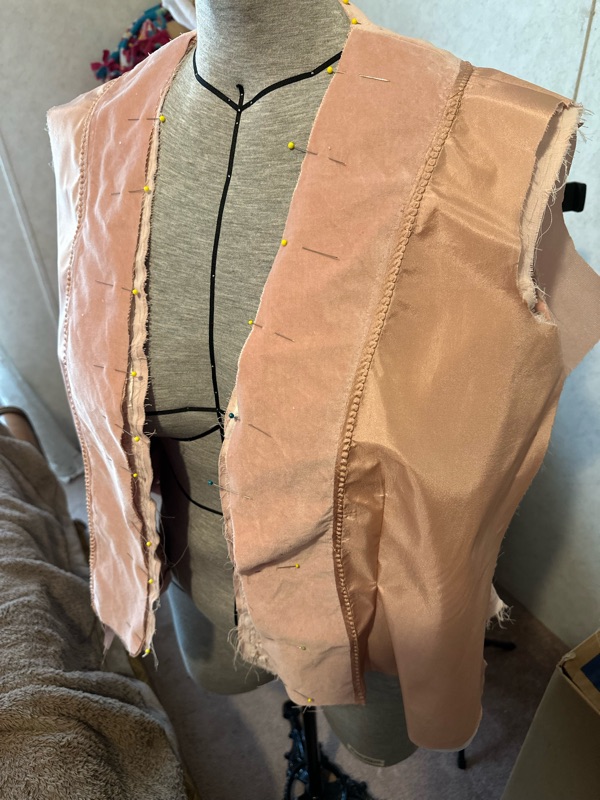 The lining is silk habotai. I did a velvet facing edge. I like to do a Hong Kong binding on the facing edge that meets the lining and attach the facing to the lining with a decorative stitch.