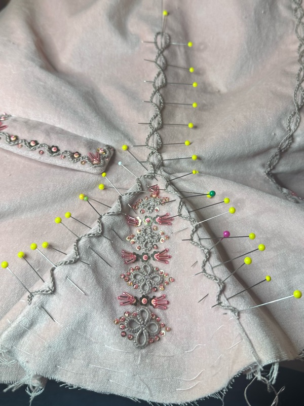 I didn’t use another backing layer like I did for the back and front. I wrapped the bars of the tambour frame with scrap fabric and just sort of draped the jacket over and pinned it to the wrapped bars to hold it in place for this final embellishment.